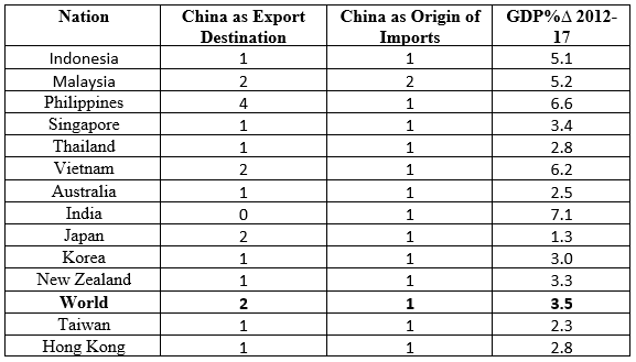 It is also unfortunate that Taiwan is excluded from this group because of Chinese opposition and possibly because of its non-nation status. The latter fact makes it easier for otherwise quite disinterested nations to agree with Chinese opinion. The irony, of course, is found in the political economy rather than the political ideology. Table 1 shows the power of China as an engine of trade growth in the RCEP, as well as for the excluded regions of Hong Kong and Taiwan: