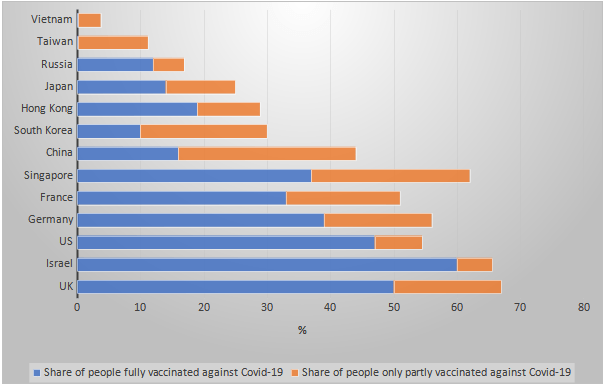 Taiwan’s current vaccination rate is one of the lowest in the world. As of July 7, 2021, only 11% of the population have been partially vaccinated (see Figure 5). This is far less than most of the advanced countries. Taiwanese people did not feel the urgency for vaccination before the spike in pandemic cases in mid-May. The hesitation suddenly turned to the rush for vaccination when people realised the necessity of job vaccines. China’s insistence on standing between Taiwan and the global vaccine supply has further complicated the vaccine shortage problems in Taiwan. Thanks to the United States and Japan’s involvement, the pressure of high vaccine demand in Taiwan was released. The United States and Japan donated a respective 2.5 million and 2.37 million vaccines to Taiwan at the time of writing. Lithuania also announced to donate 20,000 vaccines to Taiwan. With the gradual delivery of vaccines from COVAX and the development of vaccines by two Taiwanese firms, Taiwan is expected to raise its vaccination rate in the next few months gradually.