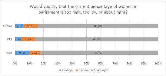 First, the survey asks, “The current percentage of women in parliament after the most recent election is 41.6%. Would you say that the current percentage of women in parliament is too high, too low or about right?”