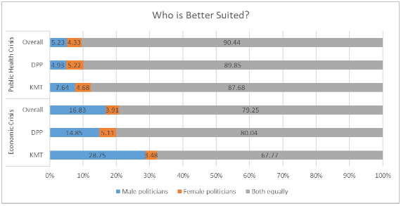 Starting with a public health crisis, see roughly 90% overall and among DPP and KMT respondents say both are equally suited, rates that are likely shaped by the current handling of the COVID-19 pandemic. However, a noticeable dip is evident when the crisis shifts to an economic one. Again, clear majorities say both male and female politicians are equally suited to handle an economic crisis. Still, the percentage stating males are more suited is three times higher or more overall, with the same pattern and across both partisan groups. Surprisingly, there was little difference between male and female respondents, with men only approximately 1% more likely to select that a man is more desirable in handling a crisis than women.