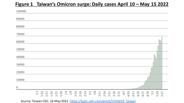 Taiwan’s smooth sailing from the very beginning through most of the spring of 2022 ran into strong headwinds when COVID-19’s highly transmissible Omicron variant took hold in Taiwan in April and quickly spread, as Figure 1 shows. As of 19 May, Taiwan’s cumulative total number of cases ballooned to 1,070,561 cases, a 40-fold increase since 9 April.