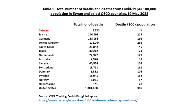 For more than two years since the global COVID-19 pandemic began in January 2020, Taiwan was remarkably successful in containing its spread and escaped the scourge of the deadly coronavirus. As of 9 April this year, Taiwan registered a low cumulative total of 26,836 cases and 854 deaths in the 27-months since the global pandemic. However, COVID-19 took its toll elsewhere in the world: more than half a billion people were infected, and 6.25 million died as of mid-May 2022. The United States alone saw more than 80 million cases, and on 16 May, the U.S. Covid death toll hit 1 million.