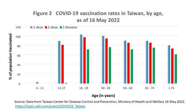 Finally, Taiwan has done well overall with vaccinating the population even though it started in earnest later than many other countries due to vaccine supply issues. As of mid-May, 86% of Taiwan’s population had had their first shot, 81% second shot, and 64% third shot or first booster. As a result, vaccinated people are less likely to get infected and develop severe diseases or die. Moreover, many vaccinated who get breakthrough Covid-19 infection have no or only mild symptoms. In Taiwan, 99.79% of cases today are either asymptomatic or have only mild symptoms. Figure 2 shows the population vaccination rates by age and number of shots received in Taiwan.