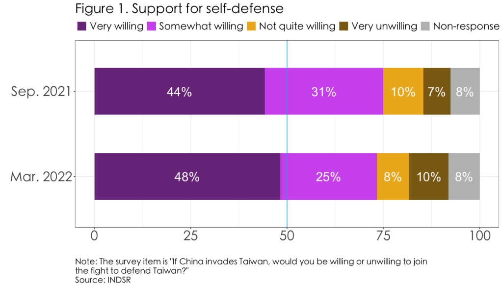 Following Russia’s ongoing invasion of Ukraine, many observers have pointed out that Kyiv’s ability to mobilise the entire population to resist the invasion is one of the main reasons why it has been able to prolong the war. Moreover, they suggest that Taiwan learn from Ukraine’s model of all-out resistance against a more powerful enemy. However, do the Taiwanese have the same determination to resist aggression as the Ukrainians have shown? Furthermore, how has the Russia-Ukraine War affected the willingness of the Taiwanese people to fight against aggression? To answer the above questions, this article analyses survey data from the Institute for National Defence and Security Research (INDSR) at two different time points before and after the Russian invasion to examine changes and continuity in support for self-defence among Taiwanese following the outbreak of the Russia-Ukraine War. The article also analyses key factors affecting the citizens’ willingness to fight for Taiwan and discusses the possible implications of the findings.