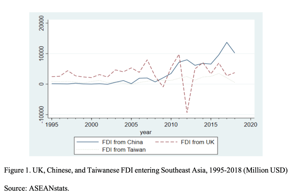For similar reasons, the ASEAN economies have attracted the attention of other powers. Within East Asia, China and Taiwan come to mind. A significant portion of China’s burgeoning foreign exchange reserve has been channelled to finance outward FDI in the region. Moreover, Chinese outward FDI has gained even more momentum after the Belt and Road Initiative (BRI) was announced in 2013. Not to be outdone, Taiwan in 2016 announced its New Southbound Policy intending to foster closer ties across the Indo-Pacific, which again includes the ASEAN member states. Given the heated competition, we have to ask: can the UK compete against China and Taiwan, at least in the arena of international investment, in Southeast Asia? To answer this question, we examine the trends and patterns of these three economies’ regional investments, focusing on two interrelated perspectives – the amount and sectoral breakdown of their FDI.