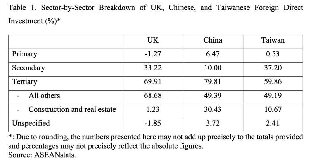 Our research also reveals that UK FDI entering Southeast Asia mainly finances the tertiary/services sector. This is understandable given the UK’s relatively mature economy compared to the region. However, it is surprising to discover that Chinese and Taiwanese FDI – often regarded as manufacturing powerhouses – entering Southeast Asia lean almost just as heavily towards the tertiary/services sector. As shown in Table 1, 33.22% and 69.91% of the UK’s FDI were from secondary and tertiary industries, respectively. China invested most of its FDI in the tertiary/services sector (79.81%); only 10.00% of China’s FDI went to the secondary/manufacturing sector. Taiwan saw 59.86% of its FDI in the tertiary/services sector and only 37.20% in the secondary/manufacturing sector.