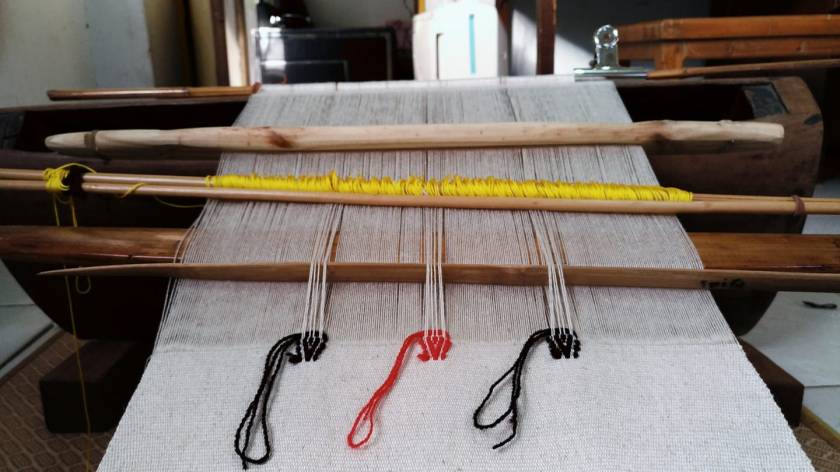 After two years of interviewing weavers, I finally began weaving myself in my thirties. My aunt from my mother’s side was willing to teach me, so I brought my grandma’s weaving loom and cloth with diamond-shaped patterns and asked her to teach me how to make it. First, she laughed, explaining I was missing some weaving tools. Then, she showed me the tools my father had made and explained their use.
