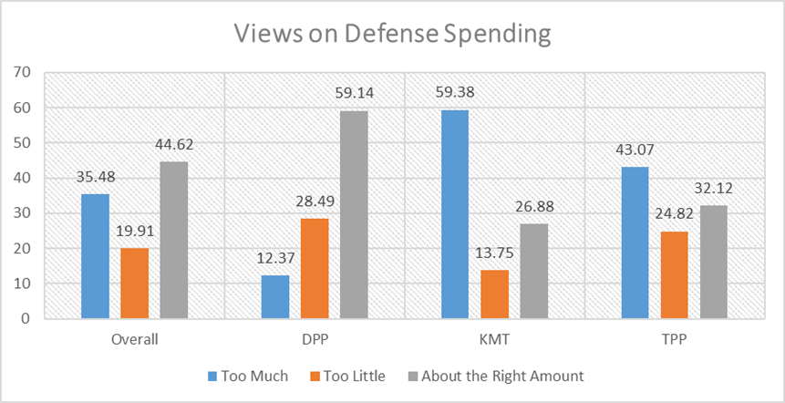 Overall, a plurality (44.62%) see defence spending as about right, with most DPP supporters stating the same (59.14%). Meanwhile, most KMT supporters (59.38%) state Taiwan is spending too much on defence, with a plurality of TPP supporters (43.07%) stating the same.