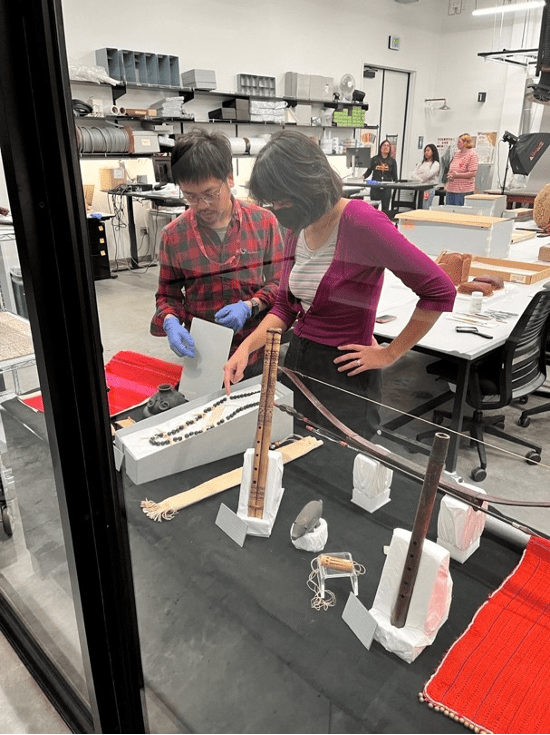 The labels on these cultural holdings offer essential details, including the date the Burke Museum acquired each item, notes and stories from the donors, and identification of the originating Indigenous communities. However, there have been instances where the origin of a cultural holding was incorrectly identified at the time of collection and documentation. This misidentification often occurred because the descriptions provided by donors were accepted without question, and sometimes, the specific Indigenous community was not recognized or acknowledged by the authoritative body. For example, the Truku were classified as Atayal before they reclaimed their name. The labels are also the canvas where I connect the cultural holdings with the contemporary struggles and challenges of the Taiwan Indigenous peoples. For example, a Pangcah (my community) necklace, a symbol of bravery and dignity, was crafted from boar tusks garnered when hunting. That necklace was purchased from a gift shop in Taiwan around 1950-60s and donated to Burke in 1971 by Mr. Charles W. Ross. I put the question on the label: “How do cultural tourism or the more recent cultural and creative industries affect Indigenous communities?” This inquiry aims to invite visitors to learn more about this topic, extending beyond Taiwan’s Indigenous communities to include others, such as the Native Americans here in Seattle, where cultural misappropriation took place. Meanwhile, it is also a moment for me to understand more about the Pangcah culture under the context of colonial Taiwan, which has led to cultural assimilation and generational disconnections, especially for young/urban Indigenous people like me.