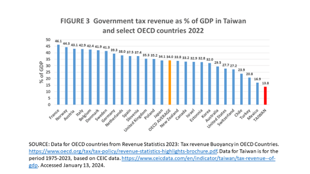 Oddly, to date, I have not seen written about or heard in open discussions among Taiwan’s policymakers and health policy circles an obvious alternative way to bring in new money for financing a higher level of health spending in Taiwan, namely, do so by increasing Taiwan’s government tax revenue as a % of GDP. Taiwan’s tax-to-GDP ratio, as depicted in Figure 3, has consistently stayed remarkably low, especially in comparison to advanced OECD countries. Averaging at 13.8%, it stands at merely 40% of the OECD average and just one-third of the ratio observed in wealthier OECD nations. To address this, a near-term objective could involve elevating this ratio to between 7.5% and 8% of GDP, with further increases envisioned in the long run.