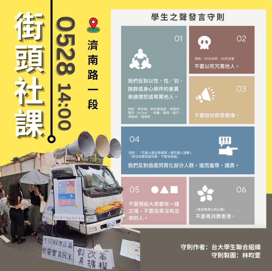 In the recent public mobilisation against legislative power abuse, or some would refer to the Bluebird action, we see the alternative ways of organising that arise from Taiwanese civil society. In the Bluebird action, protestors do not shy away from calling out misogynistic comments and sexual slurs made by the speakers. The decentralised way of organising arises from the Bluebird action that every protester has the chance to express themselves apart from the main stage, transforming the street into a classroom of collective learning and unlearning. One of the campaign trucks during the Bluebird action that draws my attention is ‘The Voice of students,’ led by NTU students. Collectively, those student organisations set up six principles to speak on the student truck (Figure 1):