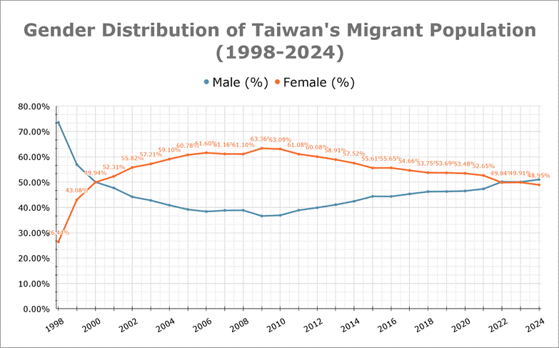 Source: Ministry of Labour (2025). Foreign Workers Statistics: Foreign Workers in Taiwan by Nationality and Sex; 勞動部勞動統計諮詢網 (2025). 引進移工在臺人數. Note: Migrant population specifically refers to Type B foreign workers employed in the productive and social welfare industries. Population figures are based on the “Employed” category rather than the “Grand Total” category, which excludes workers reported missing. Data before 1998 is unavailable. Data updated July 2025.