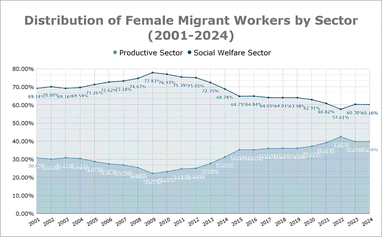 Historically, female migrant workers have long comprised the majority of Taiwan’s migrant population, only being slightly surpassed by male migrant workers since 2022 (see Graph 1). Amongst these workers, a substantial proportion of well over 60 per cent of female migrant workers are consistently employed in social welfare services as caregivers or domestic workers (see Graph 2). The gender composition in the social welfare sector reveals a stark feminisation, with well over 99 per cent being female migrant workers. This division creates distinct financial ecosystems, particularly when considering sectoral wage disparities, legal protections, and living arrangement differences.
