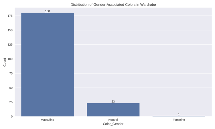As Figure 1 illustrates, masculine garments such as jackets, suits and button-down shirts completely dominated Tsai’s wardrobe choices. Similarly, as shown by Figure 2, masculine colours, such as black, blue and brown, appeared over 212 times on her feed, thus entirely obliterating any feminine colours she wore.