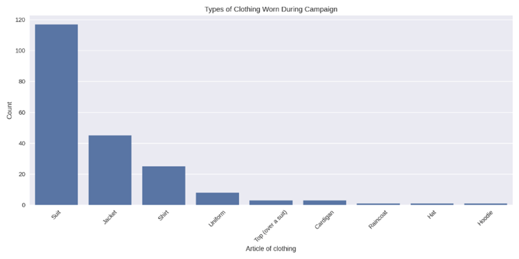 The data collected from the 2016 campaigns was separated into two graphs (the same was done for the 2020 election cycle). The first one mapped the frequency of certain garments she was wearing in her Facebook posts, while the second one illustrated the distribution of gender-associated colours she wore.