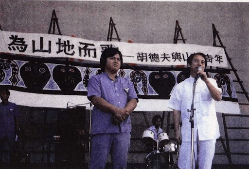 On June 20, 1984, the Haishan Coal Mine Disaster killed 72 miners, the vast majority of whom were Indigenous people from the Amis ethnic group. In response, a group of Taiwanese Indigenous activists and intellectuals organised the Singing for the Mountain Lands concert, held on June 24, 1984, in Taipei to raise funds for the families of the victims of the Haishan incident. They invited singers from all the major Indigenous ethnic groups that had official recognition at the time to perform and interspersed the musical performances with speeches and commentary on the status of Indigenous people in Taiwan, resulting in a concert that both significantly advanced the cause of Indigenous rights and served as a good overview of Taiwanese Indigenous popular music at the time. The most prominent role in the Singing for the Mountain Lands concert was played by Indigenous singer-songwriter Hu Defu (胡德夫), also known as Kimbo Hu. Hu, the son of a Puyuma father and Paiwan mother, had been one of the key early figures in the aforementioned campus folk song movement. He had been one of the first performers to bring Indigenous songs to Taipei audiences of students and intellectuals. In this concert, not only was he a featured performer, but he also served as master of ceremonies, introducing the other performers and speakers and occasionally offering commentary on the situations faced by various Indigenous groups. The concert was closely associated with the Tangwai movement; the songbook was printed by the “Tangwai Editors and Writers Association” (黨外編輯作家聯誼會), and the one political figure invited to speak briefly in the middle of the concert was the Tangwai politician Shih Hsing-chung (Shi Xingzhong; 施性忠), who had just been elected mayor of Hsinchu over ruling party opposition.