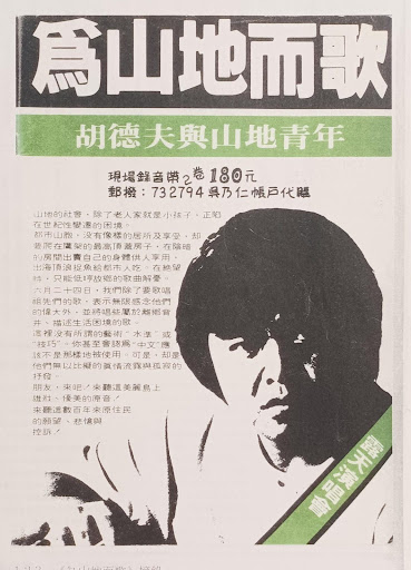 On June 20, 1984, the Haishan Coal Mine Disaster killed 72 miners, the vast majority of whom were Indigenous people from the Amis ethnic group. In response, a group of Taiwanese Indigenous activists and intellectuals organised the Singing for the Mountain Lands concert, held on June 24, 1984, in Taipei to raise funds for the families of the victims of the Haishan incident. They invited singers from all the major Indigenous ethnic groups that had official recognition at the time to perform and interspersed the musical performances with speeches and commentary on the status of Indigenous people in Taiwan, resulting in a concert that both significantly advanced the cause of Indigenous rights and served as a good overview of Taiwanese Indigenous popular music at the time. The most prominent role in the Singing for the Mountain Lands concert was played by Indigenous singer-songwriter Hu Defu (胡德夫), also known as Kimbo Hu. Hu, the son of a Puyuma father and Paiwan mother, had been one of the key early figures in the aforementioned campus folk song movement. He had been one of the first performers to bring Indigenous songs to Taipei audiences of students and intellectuals. In this concert, not only was he a featured performer, but he also served as master of ceremonies, introducing the other performers and speakers and occasionally offering commentary on the situations faced by various Indigenous groups. The concert was closely associated with the Tangwai movement; the songbook was printed by the “Tangwai Editors and Writers Association” (黨外編輯作家聯誼會), and the one political figure invited to speak briefly in the middle of the concert was the Tangwai politician Shih Hsing-chung (Shi Xingzhong; 施性忠), who had just been elected mayor of Hsinchu over ruling party opposition.
